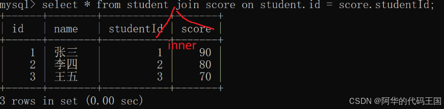 写法①:select * from student , score where student.id = score.studnetId; 写法②:select * from student (inner) join score on student.id = score.studentId; // inner join 就是内连接额意思,此处的inner可以省略