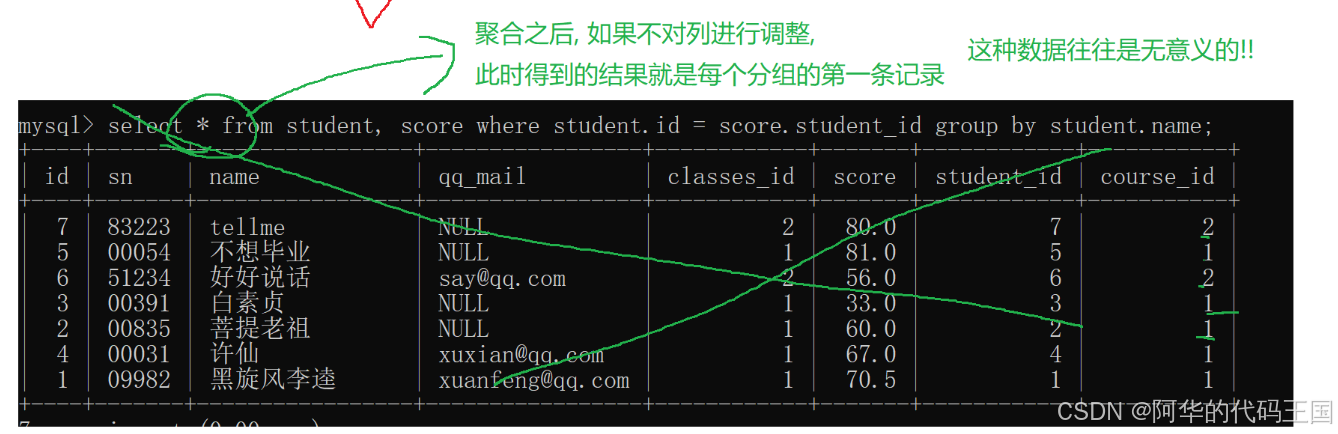 误区:没有“使用聚合的列”也可以和聚合函数完的列成为同一行数据