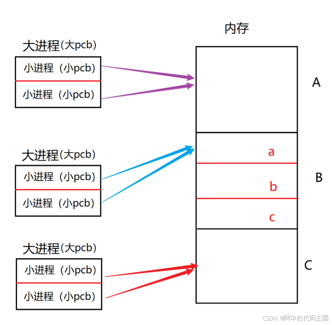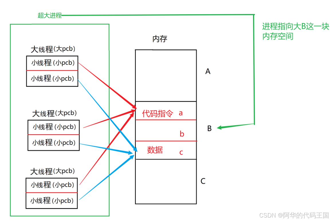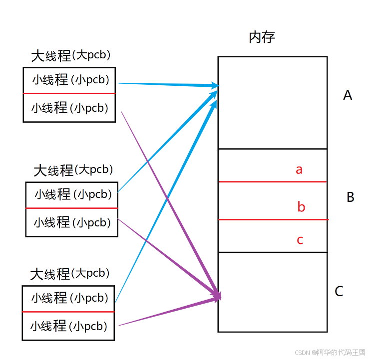 每个进程都可以包含一/多个线程,像有三个小线程的小pcb都指向了a,它们获取a中的代码指令的用途不一定相同(即各取所需)有一个线程申请了a这一块空间后,后面的线程就不必在申请了,大大降低了频繁申请空间和释放空间带来的资源浪费