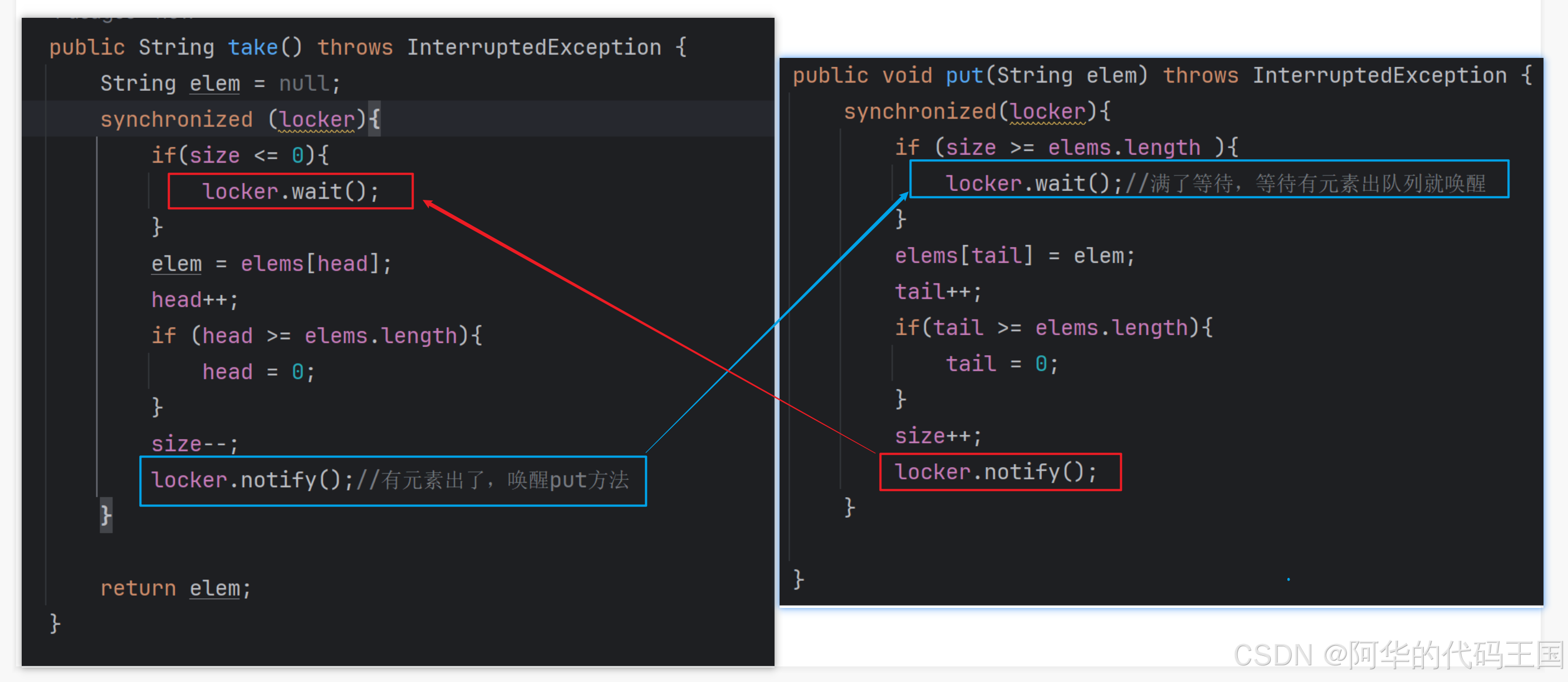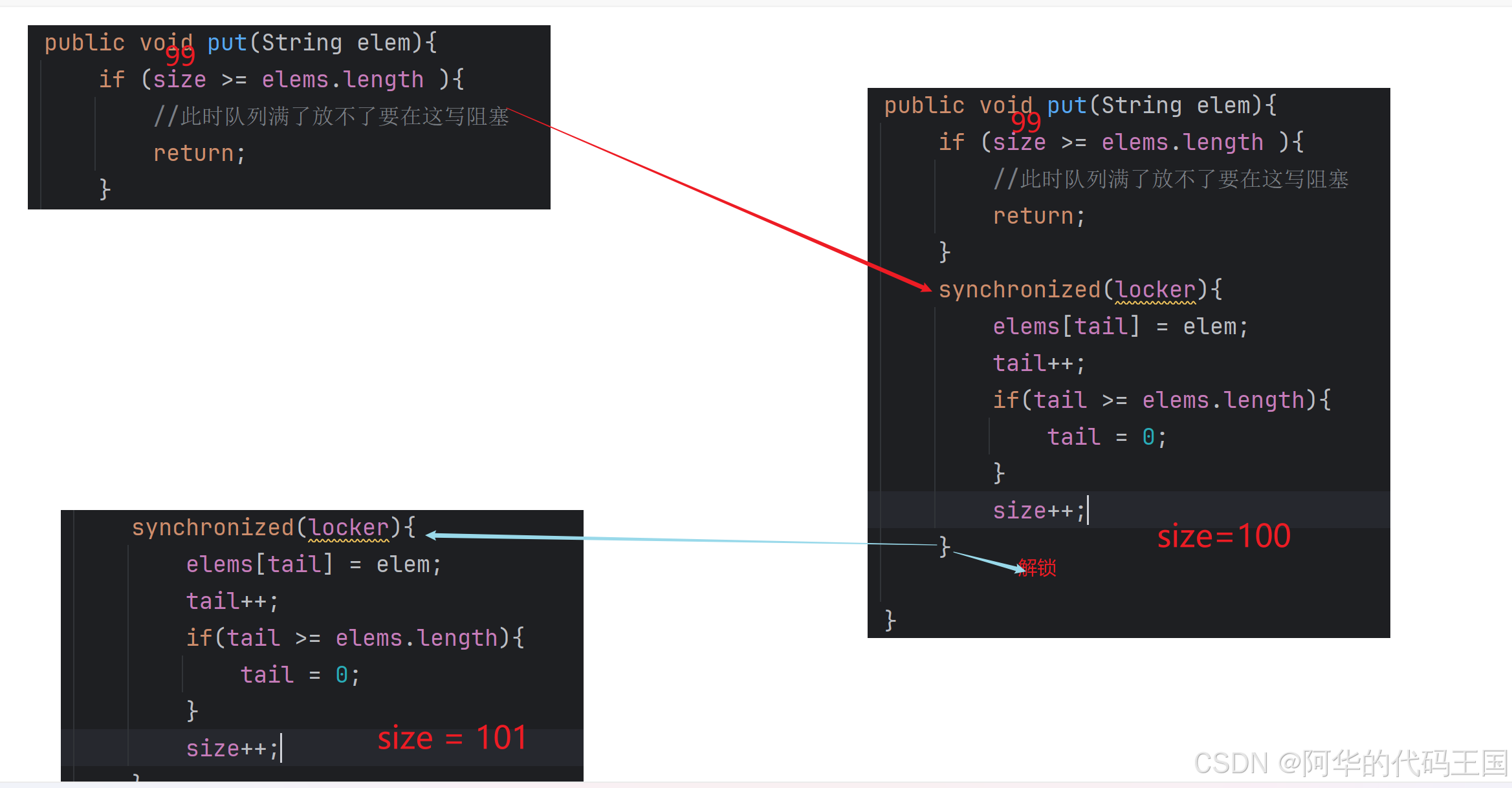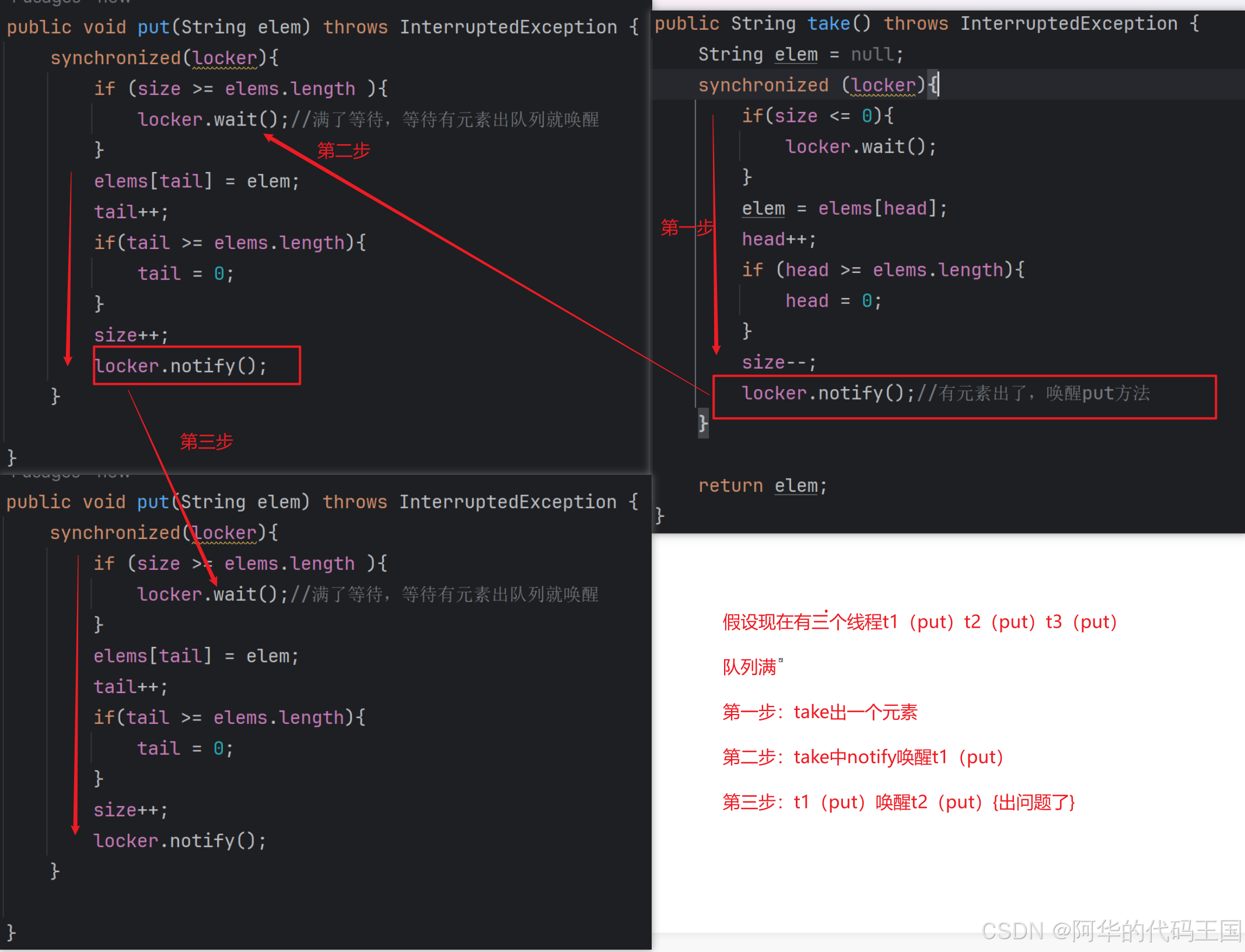 可以看到上述图例:假设现在队列满,两个put都阻塞,take出了 一个元素,唤醒了第一个put,第一个put又唤醒了第二个put,这就出问题了
