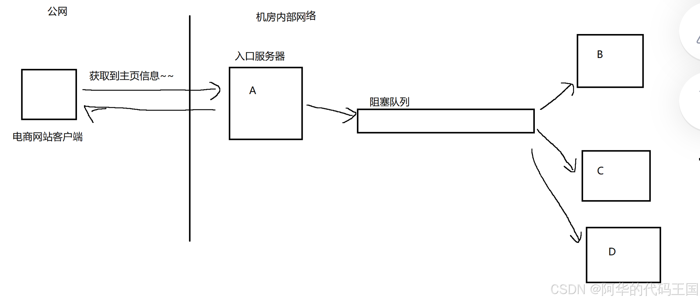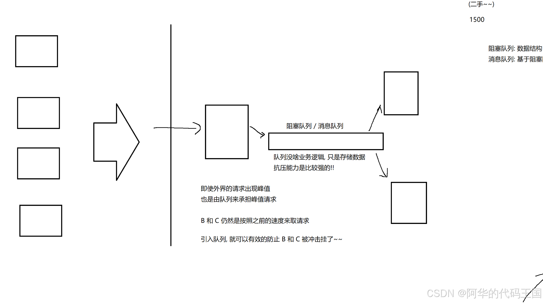 但在上述图中,A与B,A与C之间的耦合性比较强,有一个挂了,很可能就会影响到其它的服务器,于是我们引入队列阻塞