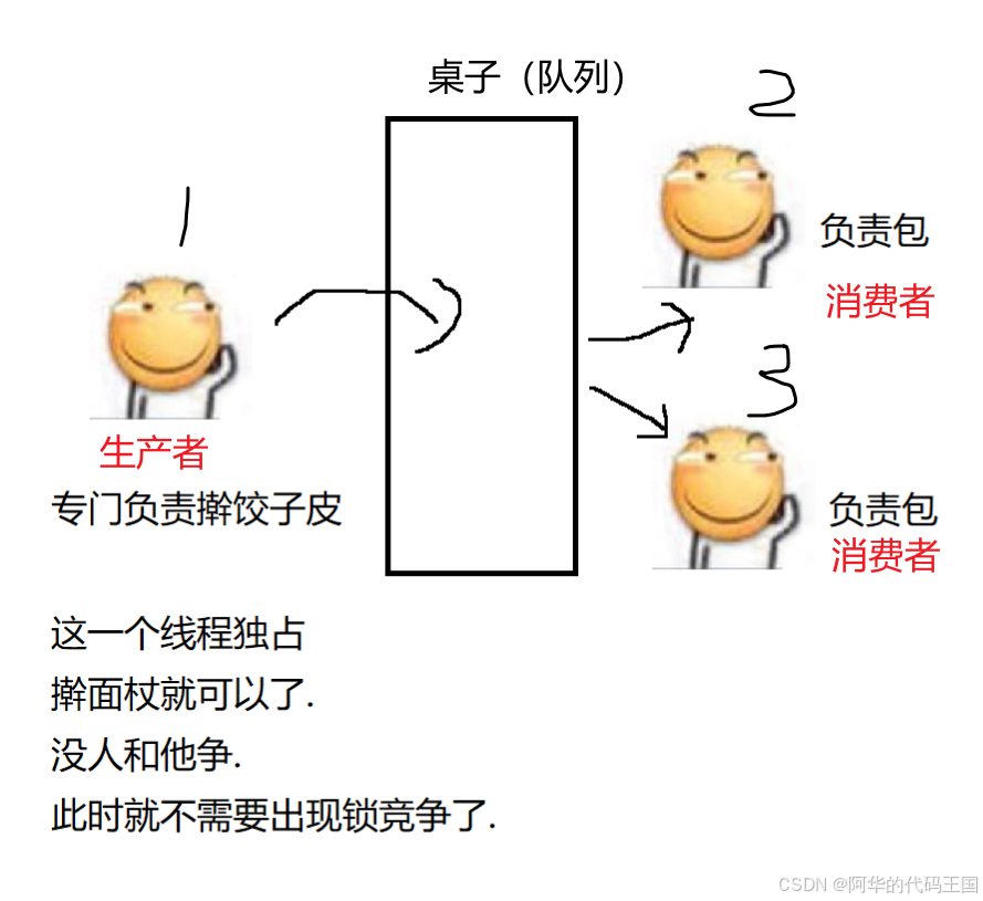 上述图,一号老铁负责专门撵饺子皮(生产),2,3号负责包饺子,桌子(阻塞队列)负责传递饺子皮,大大提高了包饺子的效率。