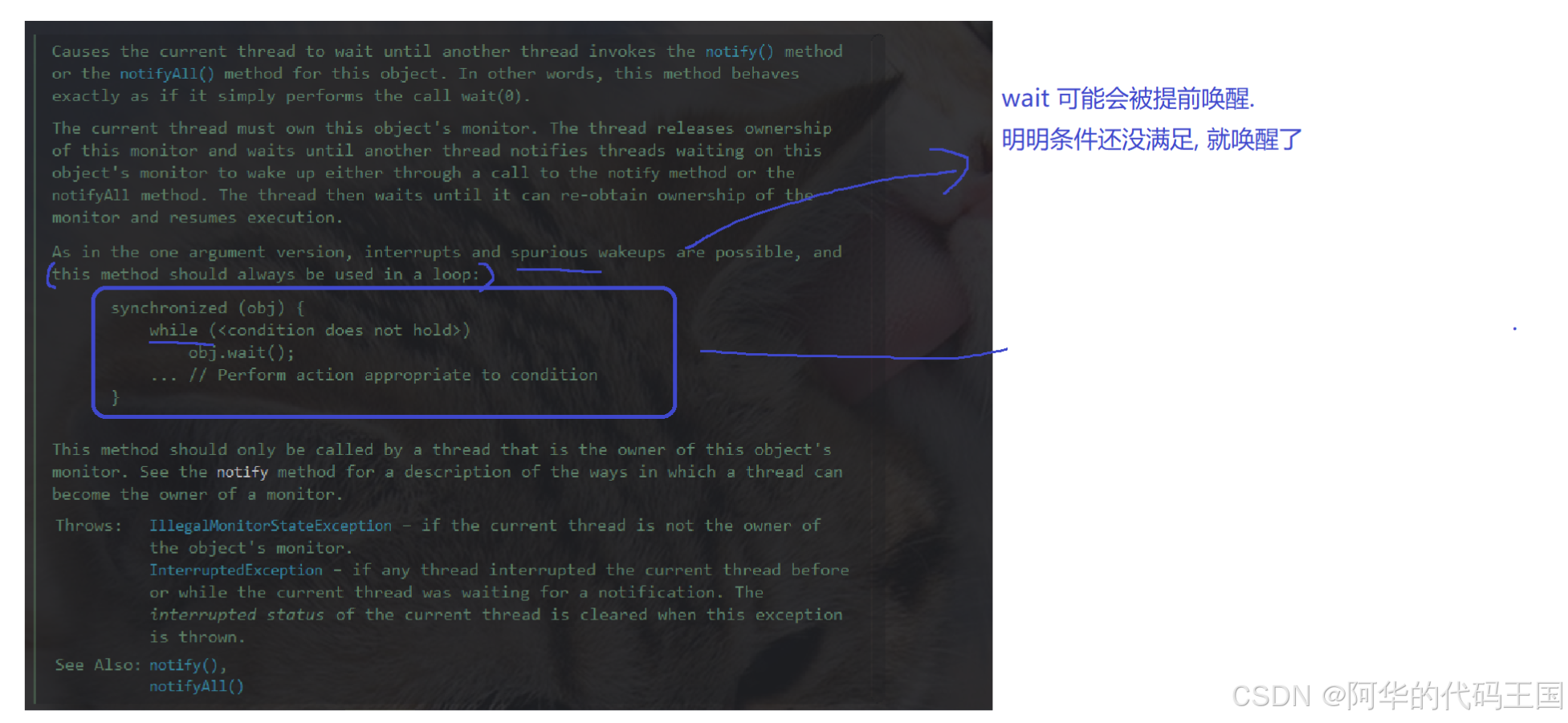 于是我们引入替换成——while语句,句内的wait被唤醒后会再一次进行条件判断,如果此时条件,不满足,会再一次的陷入wait等待。
