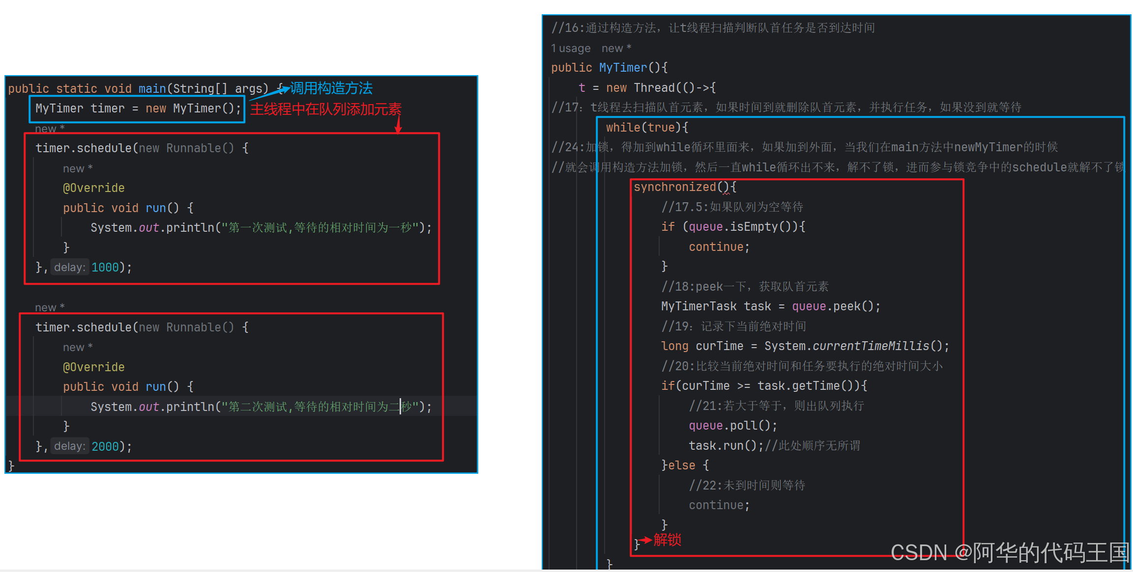 //23:这里main方法中添加任务和MyTimer中出任务会引发多线程安全问题,这里我们使用锁对象来保护队列,那么在哪里加锁比较合适呢