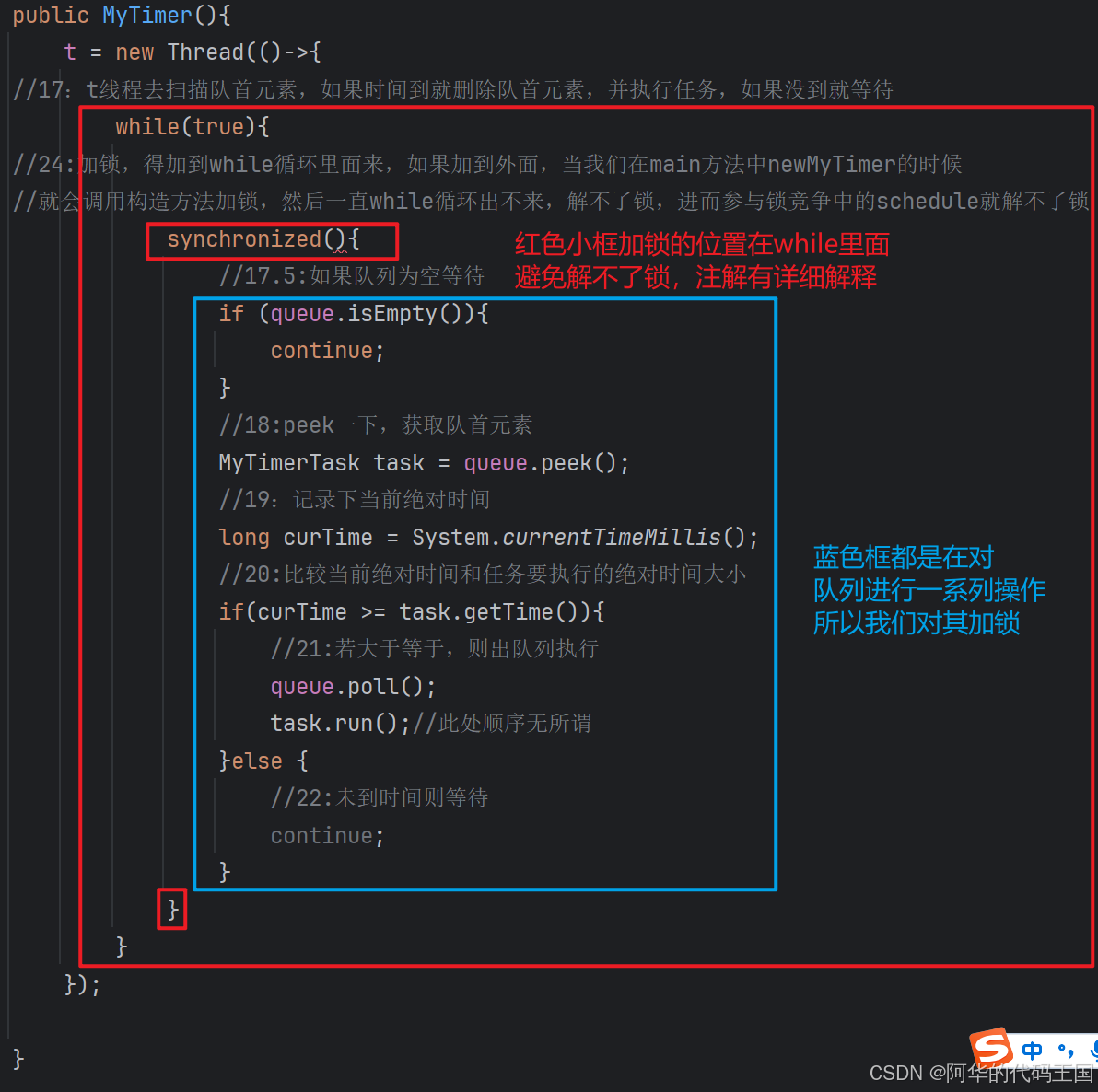 //24:加锁,得加到while循环里面来,如果加到外面,当我们在main方法中newMyTimer的时候