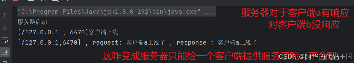 本质原因: accept使用了一次while循环,processClient方法中又嵌套了一层while循环 导致在服务器在处理客户端A的请求时,一直在processClient方法中出不来,就执行不了第二次客户端B的accept (内核中:客户端B和服务器已经建立了TCP连接,但是用户态应用程序这里无法处理到,也就是拿不到) (理解成:别人给你打电话,电话响了,但是你不接) 重点:虽然处理不了客户端B的数据请求,但是B的数据请求会暂时放在Socket缓冲区中(缓存区不能无限放数据,有大小限制的,所以可能会存在数据丢失的情况),等A端下线后,B端的请求会被瞬间处理掉