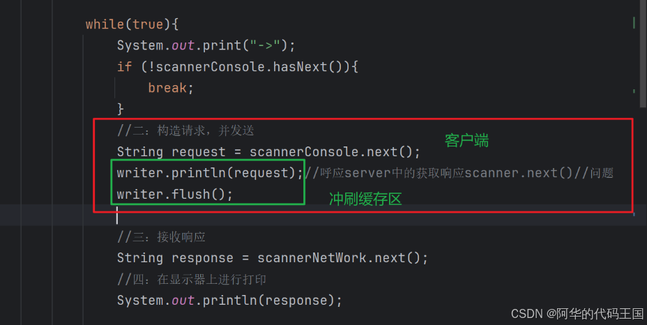 writer.println(request);//呼应server中的获取响应scanner.next()//问题