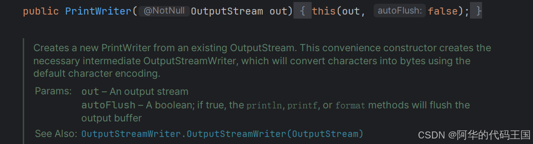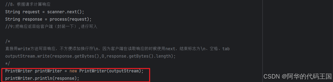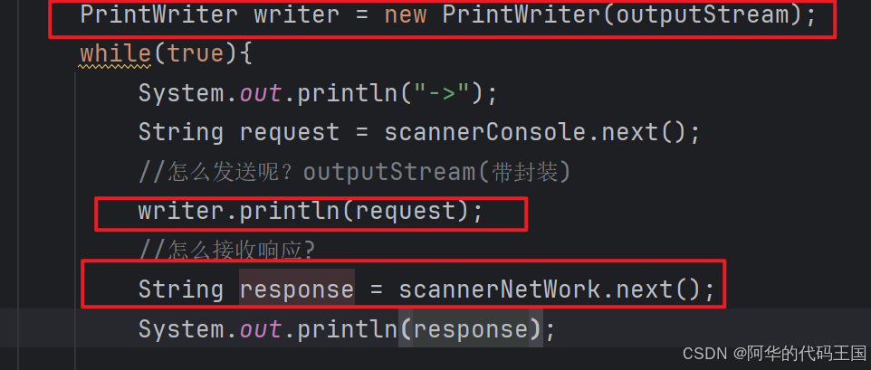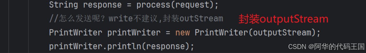 直接用outputStream的write方法不方便写换行符\n,所以给outputStream“封装一下”,用outputStream帮助PrintWriter进行构造,再使用println方法实现自动换行