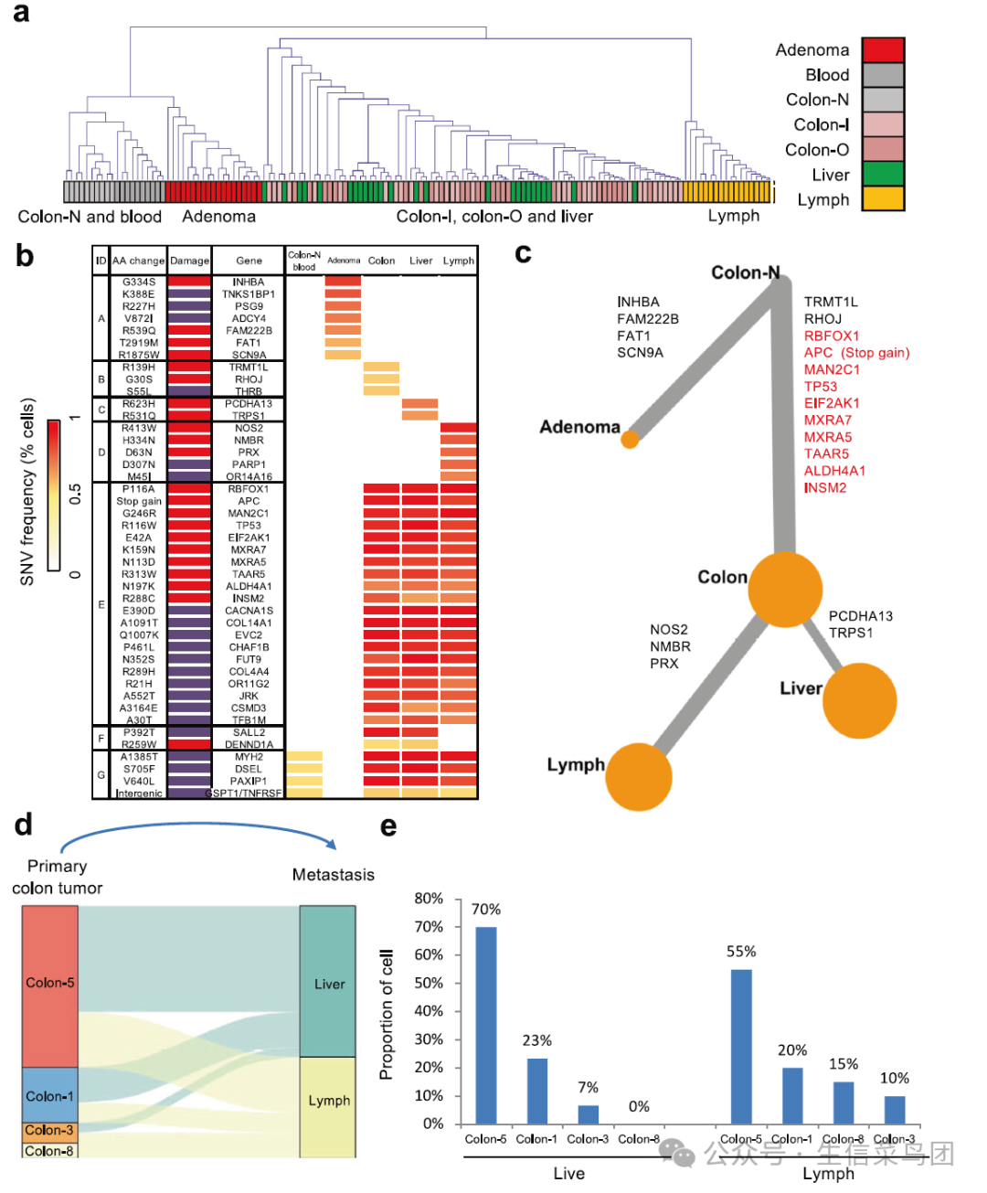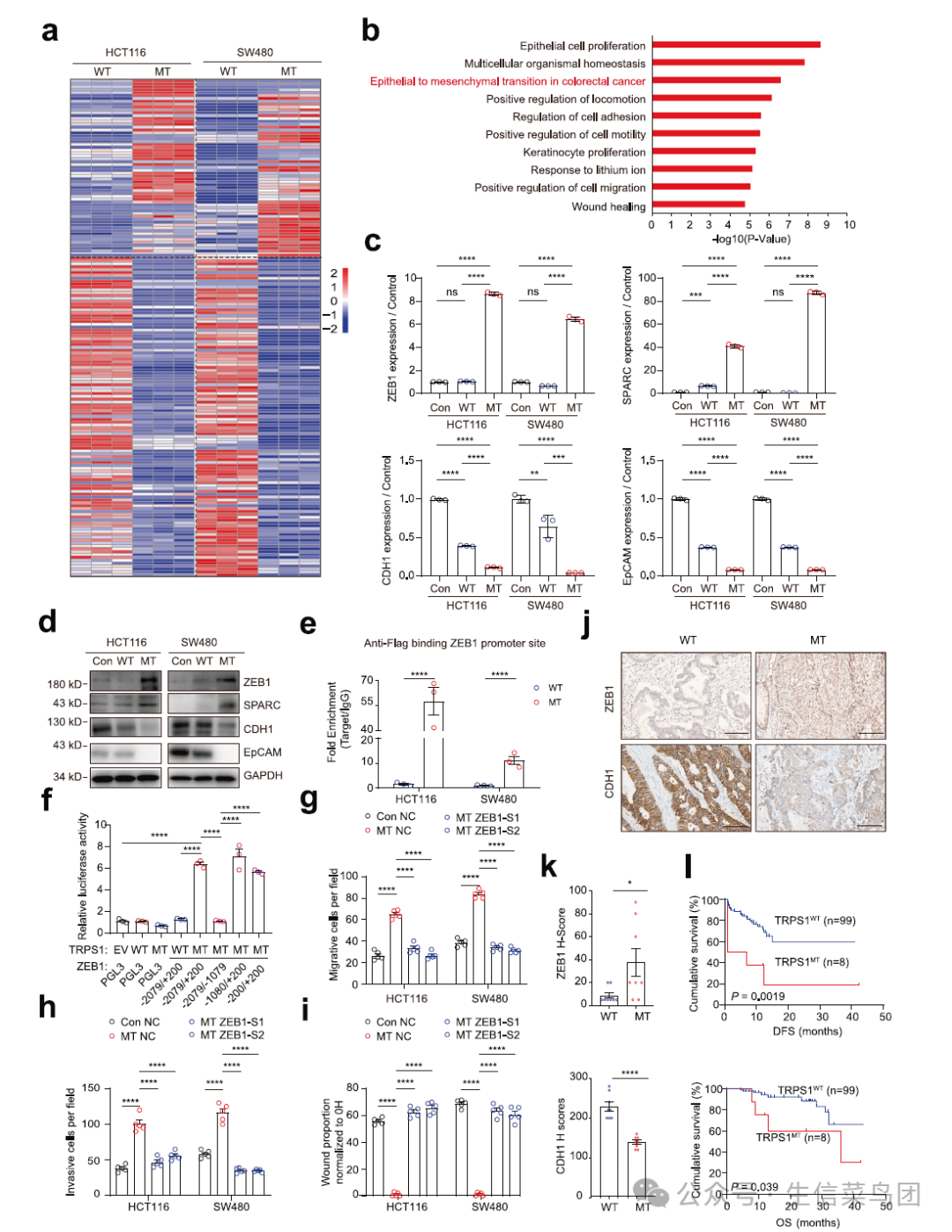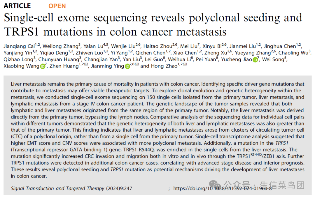 研究通过一例转移性CRC患者多病灶取样进行单细胞外显子测序,发现结直肠癌的淋巴转移和肝转移均起源于原发肿瘤的同一区域。肝转移和淋巴转移的遗传异质性比原发肿瘤更大,这支持了转移可能来自原发肿瘤中的肿瘤细胞群的模型。随后的细胞系、小鼠模型等实验表明,TRPS1 R544Q 突变促进了结直肠癌细胞的运动性和侵袭性。TRPS1 R544Q突变通过激活ZEB1表达来促进上皮-间质转化,从而增强结直肠癌的转移能力。综上所述,这项研究揭示了结直肠癌转移的新机制,并可能为结直肠癌的治疗提供新的靶点。