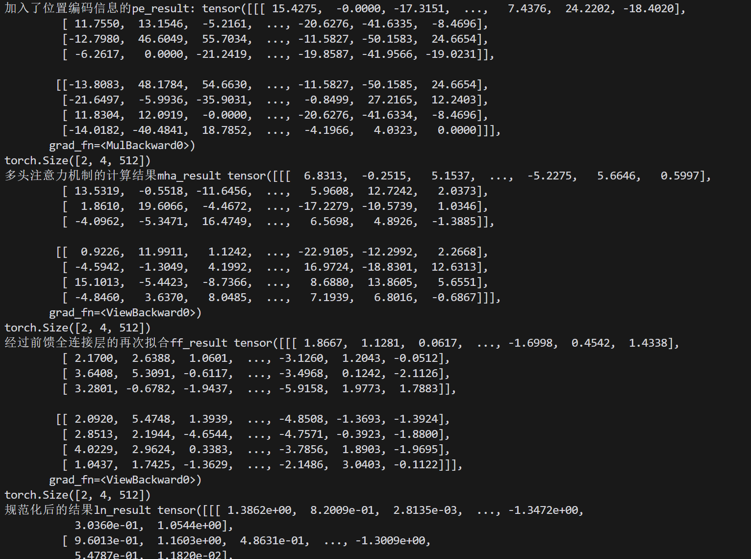 # 这个输出表示解码器对输入序列的特征表示,还没有经过生成器映射到词汇表大小的维度