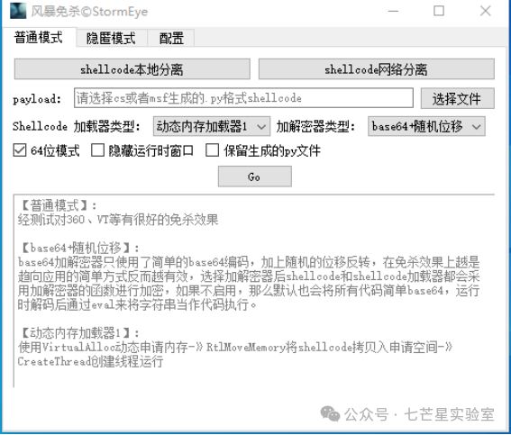 python3 StormBypassAV.py2、支持普通和隐匿2种模式: