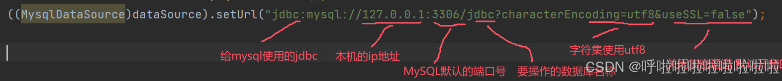 ((MysqlDataSource)dataSource).setUrl("jdbc:mysql://127.0.0.1:3306/jdbc?characterEncoding=utf8&useSSL=false");