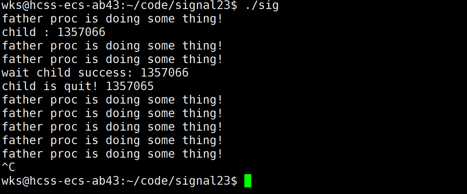 }SIGCHLD 信号)。当接收到相应信号时,这个函数就会被调用执行。sig,代表接收到的信号编号,不过在这个函数内部其实并没有使用这个参数来做不同的分支处理,它主要关注的是处理子进程退出的情况。while 循环,循环条件是 (id = waitpid(-1, NULL, WNOHANG)) > 0: waitpid 函数用于等待子进程状态改变并获取相关信息,这里的参数 -1 表示等待任意子进程(如果指定具体的子进程ID,就只会等待那个特定的子进程);NULL 作为第二个参数表示不关心子进程的终止状态信息(如果想获取具体状态,可以传入相应的指针来接收状态值);WNOHANG 是一个宏,它使得 waitpid 函数在没有已终止的子进程可等待时立即返回,而不是阻塞等待。waitpid 调用返回的值大于 0,就意味着成功等到了一个已终止的子进程,此时进入循环体,通过 printf 打印出等待到的子进程的进程ID(printf("wait child success: %d\n", id);)。这个循环可以连续处理多个同时终止的子进程(如果存在这种情况)。printf 打印出当前进程(也就是父进程)的进程ID,表示子进程已经退出完毕,当前提示信息所在的进程(父进程)还在运行(printf("child is quit! %d\n", getpid());)。main 函数部分int main()