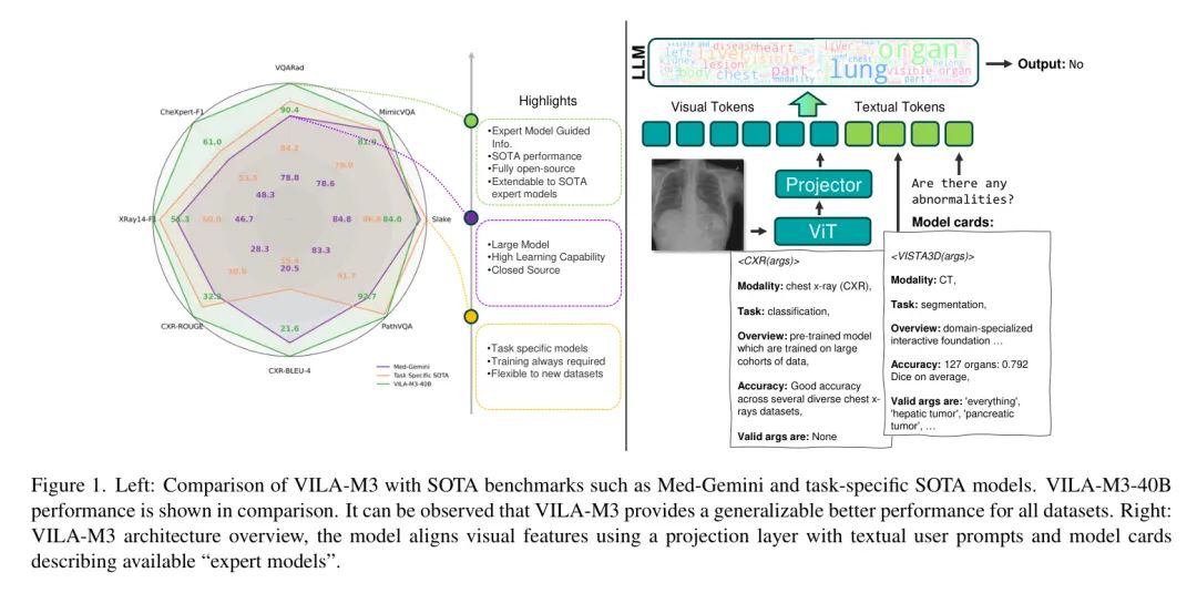 提出的VILA-M3模型在多模态机器学习方面对医疗保健领域取得了重大进展。它作为通用的模型以及融合专家模型响应来解决复杂任务,实现了SOTA性能。