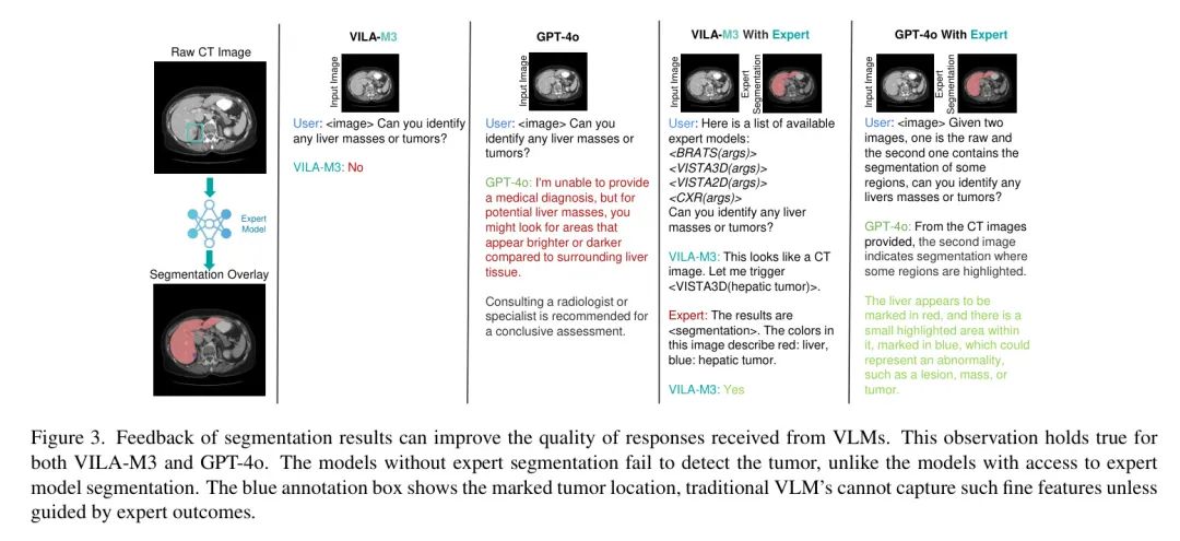 对于分割任务,观察图3可以发现,如果未提供分割信息,作者的模型VILA-M3无法检测到肿瘤的发现。然而,当包含额外的专家信息时,它能够检测到肿瘤的更细微特征。