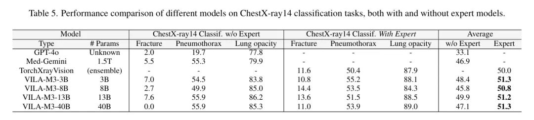 专家模型效果:为了验证领域专家模型的发现,作者使用VILA-M3在4.2节中概述的相同训练设置进行了实验。特别是,对于带有和不带专家反馈的分类,作者使用了TorchXrayVision [8]的 Baseline ,并与OpenAI的旗舰模型GPT-40 [1, 20]进行了比较,该模型用于ChestX-ray-14和CheXpert数据集,见表5和6。