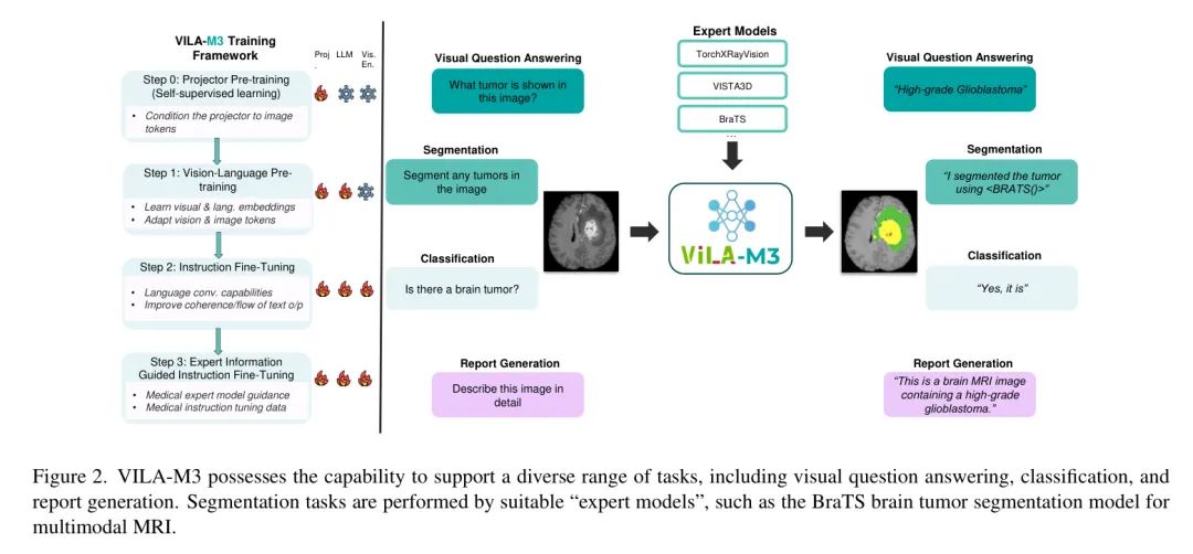 通用视觉语言模型(VLMs)在计算机视觉领域取得了显著进展,但在医疗等专业化领域,专家知识至关重要。在传统计算机视觉任务中,创造性或近似答案可能可以接受,但在医疗领域,精确度至关重要。当前的大型多模态模型(如Gemini和GPT-4o)由于依赖于记忆的互联网知识而不是医疗领域所需的细微专业知识,对于医疗任务来说是不够的。 同时,现有的医学VLMs(如Med-Gemini)在设计中通常缺乏专家咨询,而且许多依赖于过时、静态的数据集,这些数据集没有考虑到现代大型深度学习模型的需求。 VLMs通常分为三个阶段:视觉预训练、视觉语言预训练和指令微调(IFT)。IFT通常使用通用和医疗数据混合进行应用。 然而,作者提出,对于医学VLMs,第四个阶段的专业化IFT是必要的,它专注于医疗数据,包括来自域专家模型的信息。开发用于医疗目的的域专家模型至关重要,因为它们专门针对某些临床任务进行训练,例如通过分割和分类来检测肿瘤和分类异常,这些异常的特征往往对于通用VLMs来说过于复杂。 本文介绍了一种新的医学VLMs框架,即VILA-M3,该框架通过域知识通过专家模型来实现。开发用于医疗目的的域专家模型用于检测肿瘤和分类异常(分割,分类),这些模型学习与通用VLMs可以处理的大粒度特征相比的细粒度特征。 作者认为,仅依赖通用VLMs架构在实际临床应用中是不可行的,并且对于医疗领域,需要根据需要使用域专业专家模型的知识来推进AI。通过作者的实验,作者展示了相对于先前的SOTA模型Med-Gemini的平均改进约为9%,相对于专门任务的模型训练的平均改进约为6%。 作者的方法强调在创建精确、可靠的医学VLMs方面,域专业知识的重要性。