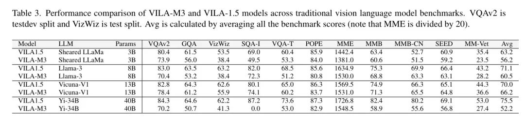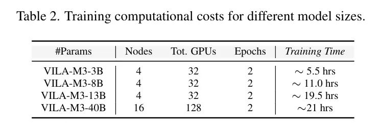 分别针对参数大小不同的三个模型在1、2和3个epoch上进行训练。通过比较表1中观察到的所有参数大小变体,确定了表现最佳的VILA-M3模型。