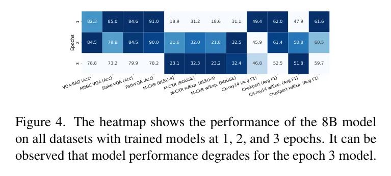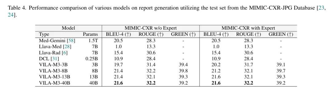 评估指标:准确率被用作衡量VQA任务封闭式问题的性能。F1分数用于分类任务。对于报告生成,作者使用三种不同的指标:BLEU-4、ROUGE和GREEN分数,它旨在成为一种更具有临床相关性的度量[40]。总的来说,报告生成评估更具挑战性,这些指标从不同的视角全面理解性能。