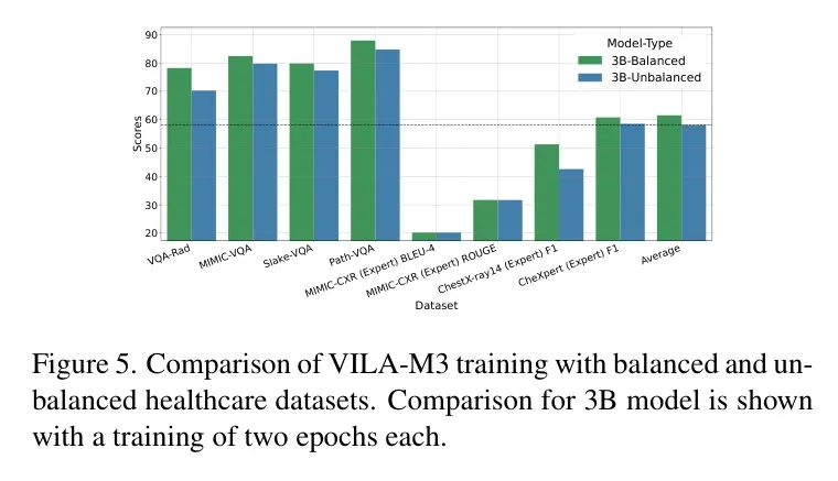 平衡 vs 不平衡数据集:数据集的原大小差异很大,特别是在VQA数据集和MIMIC-CXR之间的原始数字进行比较时。因此,作者在类别(基于VQA、专家、报告生成和分类类型)方面以分步方式增加低计数数据集的频率,以系统地平衡训练数据集。训练设置与第4.2节中概述的一致。训练数据集的频率计数表格可在补充材料中找到。