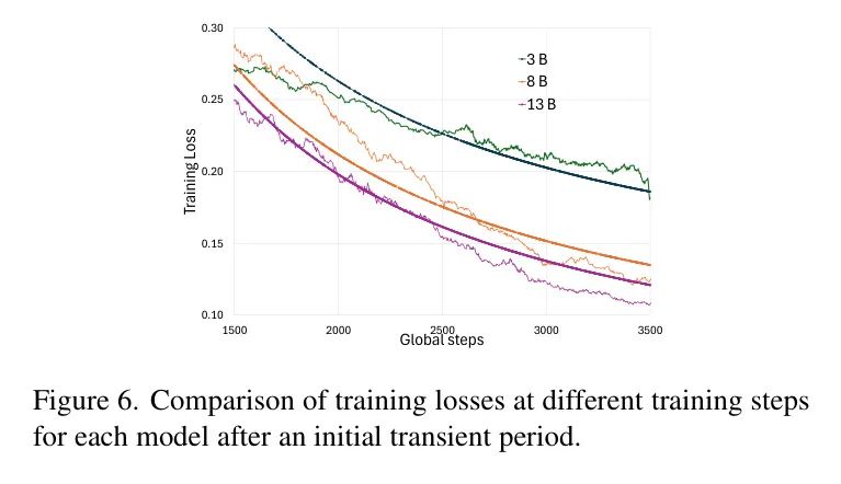 尽管采用了不同的模型架构和大小,作者观察到所提出的训练程序在所有情况下都成功收敛,并且对超参数选择的敏感性不强。以使用4个节点(32个GPU)训练的模型为例,图6显示了在相同训练数据集下,训练损失与模型大小符合预期地按经验幂律[25]增长。