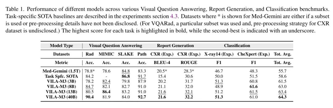 VILA-M3 超越了 SOTA:作为基准比较,作者直接使用 Med-Gemini 工作的结果 [58] 和特定任务的 SOTA 基准 [6, 8, 28, 31]。总体而言,图1 中观察到的结果表明,与现有可公开或闭源的 SOTA 方法相比,性能更优越。特别是,与包含 1.5 万亿参数的 Med-Gemini 相比,使用参数更少的模型(如几个十亿参数)可以在 8 个指标中实现显著更高的性能。