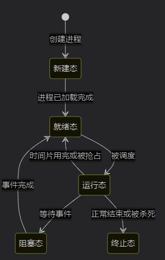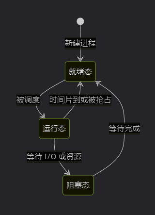 三态模型是最基础的进程状态模型,将进程的生命周期划分为三个主要状态: