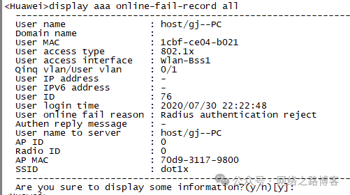 display aaa online-fail-record all:查看AAA认证失败的原因