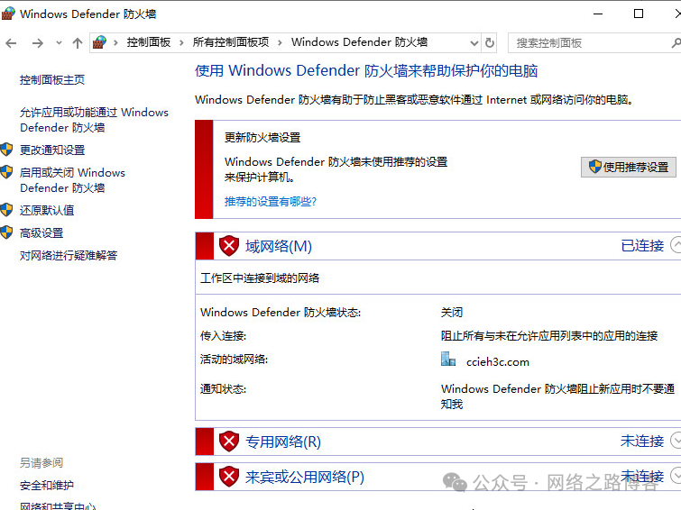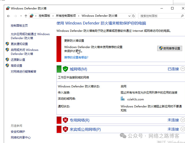 在控制面板里面,发现域网络的防火墙是开启的。