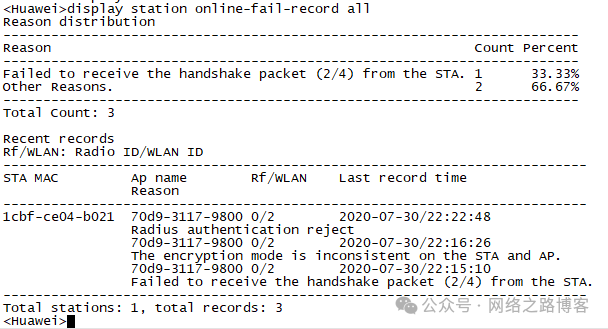 6、在遇到客户端接入不成功的情况下,我们要利用查看命令 display aaa online-fail-record all display station online-fail-record all 包括Windows服务器的日志都能给出提示出现在哪个环节。
