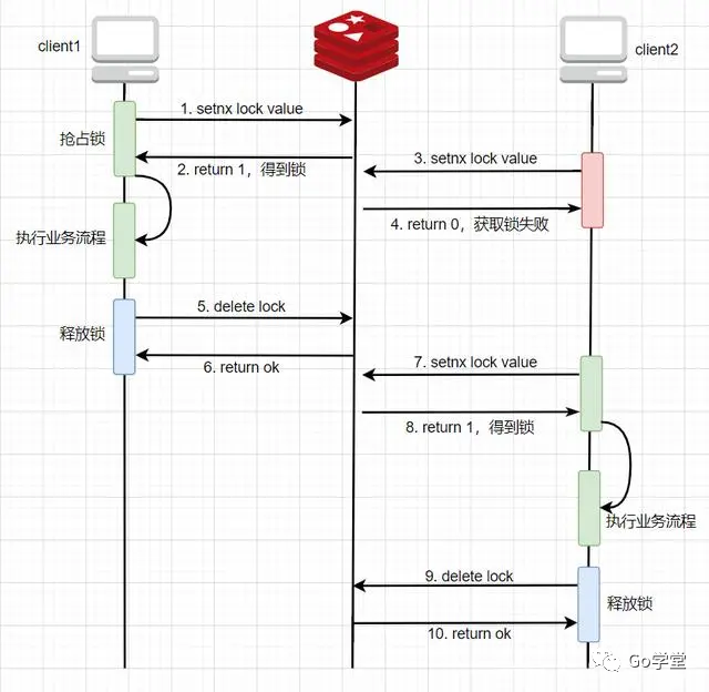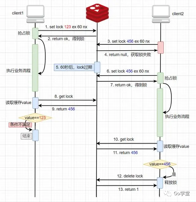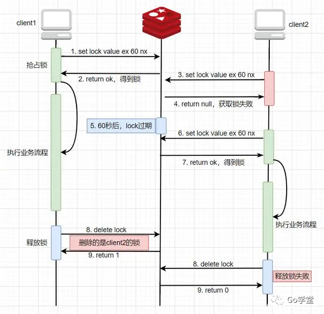 释放锁的本质就是将对应的key从redis中删除。使用delete操作即可。但在删除时要防止误删的情况。例如,client1获得锁之后开始执行业务处理,但业务处理耗时较长,超过了锁的过期时间,导致业务处理还没结束时,锁却过期自动删除了(相当于属于client1的锁被释放了),此时,client2就会获取到这把锁,然后执行自己的业务处理,也就在此时,client1的业务处理结束了,然后向Redis发送了delete key的命令来释放锁,Redis接收到命令后,就直接将key删掉了,但此时这个key是属于client2的,所以,相当于client1把client2的锁给释放掉了: