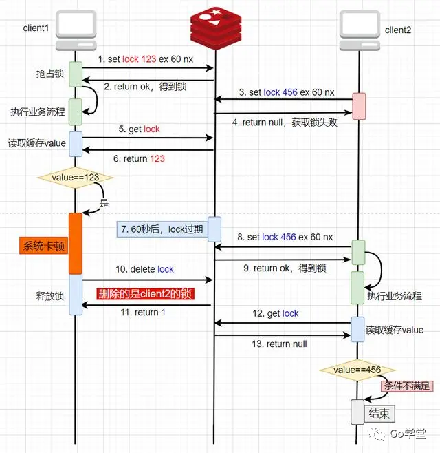 这里还有一个问题就是判断锁是否属于当前线程和释放锁两个步骤并不是原子操作。正常来说,如果线程1通过get操作从Redis中得到的value是123,那么就会执行删除锁的操作,但假如在执行删除锁的动作之前,系统卡顿了几秒钟,恰好在这几秒钟内,key自动过期了,线程2就顺利获取到锁开始执行自己的逻辑了,此时,线程1卡顿恢复了,开始继续执行删除锁的动作,那么此时删除的还是线程2的锁