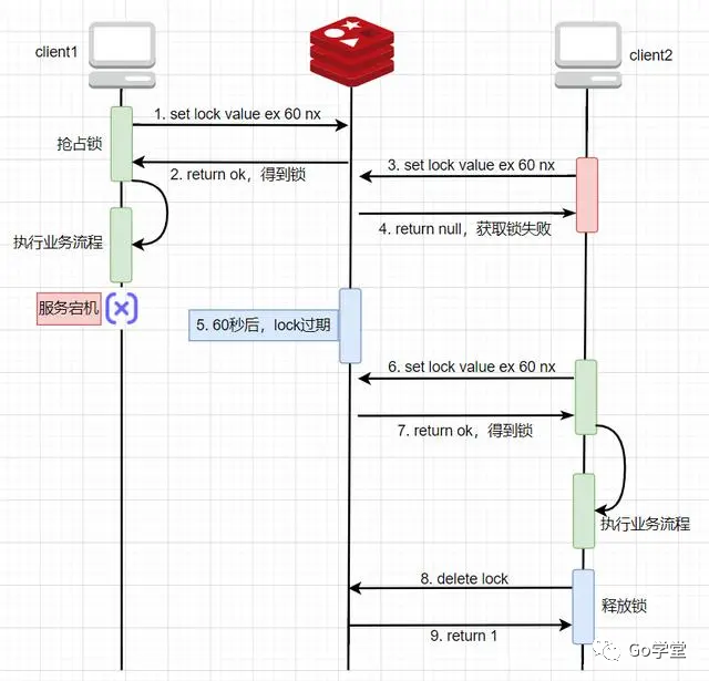 这里给setnx设置过期时间是为了防止该所永远得不到释放的产生。假设没有给key设置过期时间,万一程序在发送delete命令释放锁之前宕机了,那么这个key就会永久的存储在Redis中了,其他客户端也永远获取不到这把锁了。