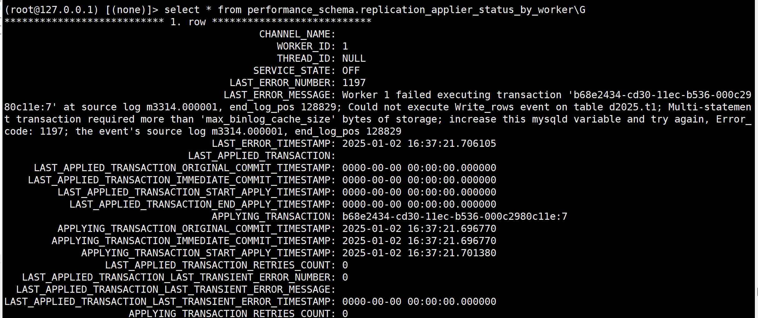 报错为Worker 1 failed executing transaction 'b68e2434-cd30-11ec-b536-000c2980c11e:7' at source log m3314.000001, end_log_pos 128829; Could not execute Write_rows event on table d2025.t1; Multi-statement transaction required more than 'max_binlog_cache_size' bytes of storage; increase this mysqld variable and try again, Error_code: 1197; the event's source log m3314.000001, end_log_pos 128829
