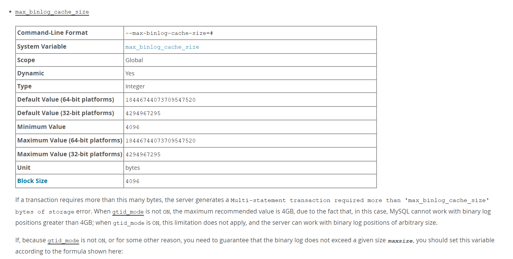 大意就是该参数最大值是2^64, 最小值是4096(之前有讲过binlog对4096取整,也写过相关的脚本.), 是全局参数(毕竟是在服务器上的磁盘写数据的嘛), 支持动态修改(不用重启,不影响业务,也就是可以应急修改). 还有很多信息,比如没有gtid的时候binlog限制4GB,有gtid就没得这个限制.