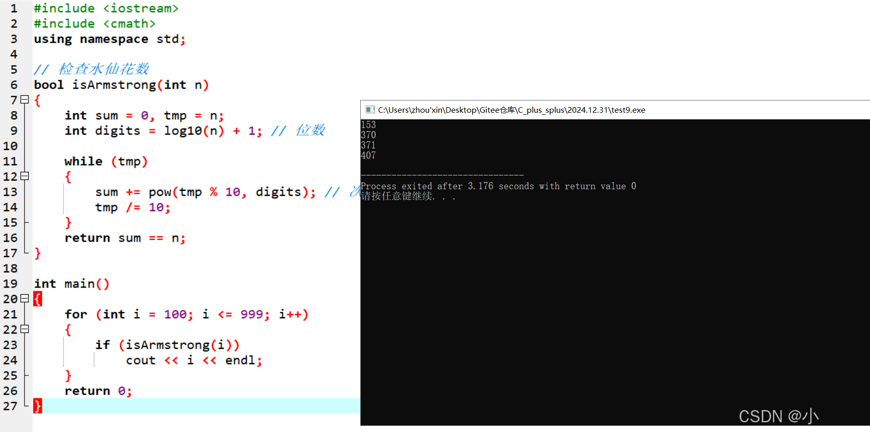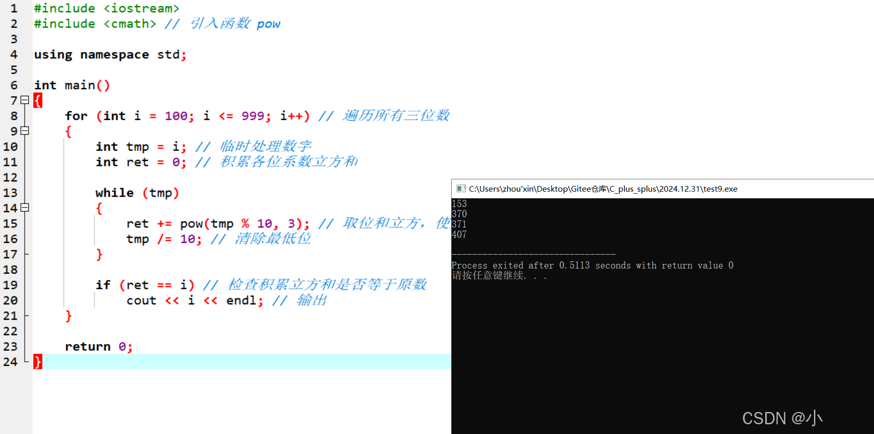 ret += pow(tmp % 10, 3); // 取位和立方,使用pow函数