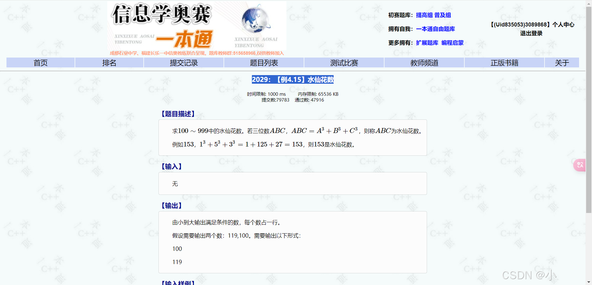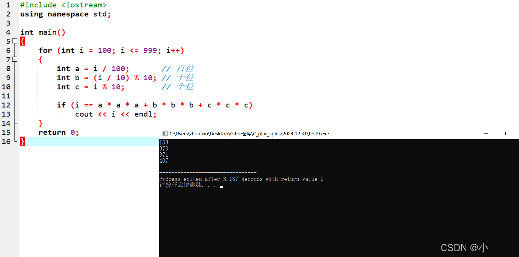 for 循环遍历 [100, 999] 范围内的所有数字,以判断每个数字是否是水仙花数。m 存储当前数字,无需直接操作原数。count 用于积累各位系数立方和。while 循环: m % 10 获得最低位;j * j * j 直接计算立方值;m /= 10,将数字左移一位;循环至数字为 0 为止。老师的代码如下: