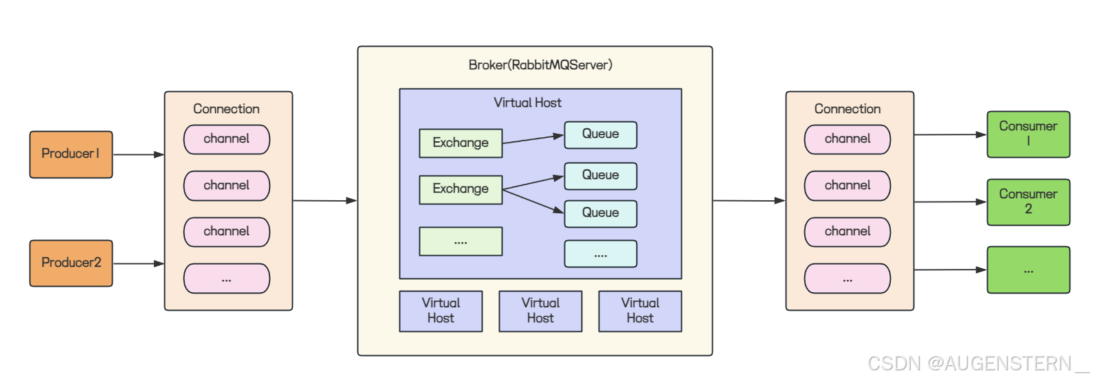 Channel: 通道, 信道. Channel是在Connection之上的⼀个抽象层. 在 RabbitMQ 中, ⼀个TCP连接可以有多个Channel, 每个Channel 都是独⽴的虚拟连接. 消息的发送和接收都是基于 Channel的.