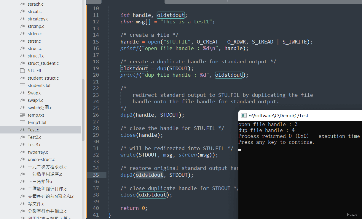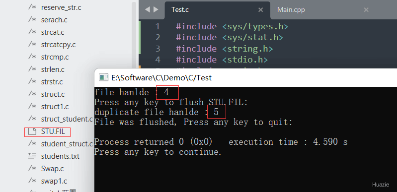 "STU.FIL"的文件,并以写入模式打开。"This is a test"写入该文件。"temp.txt" 的文件,并获取其文件句柄。"STU.FIL" 文件。flush函数来刷新文件缓冲区。fflush函数来刷新传入的文件流的缓冲区;dup函数复制文件描述符,并将其存储在duphandle变量中;