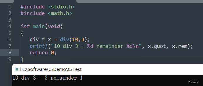 printf("10 div 3 = %d remainder %d\n", x.quot, x.rem);