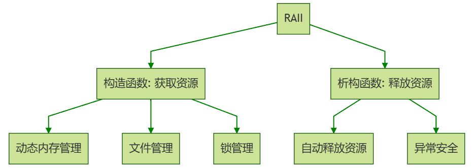 }RAII 确保资源在对象生命周期结束时自动释放,无需手动管理资源。这可以有效避免资源泄漏。
