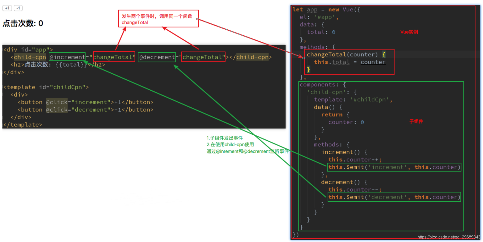 <child-cpn @increment='changeTotal' @decrement='changeTotal'></child-cpn>