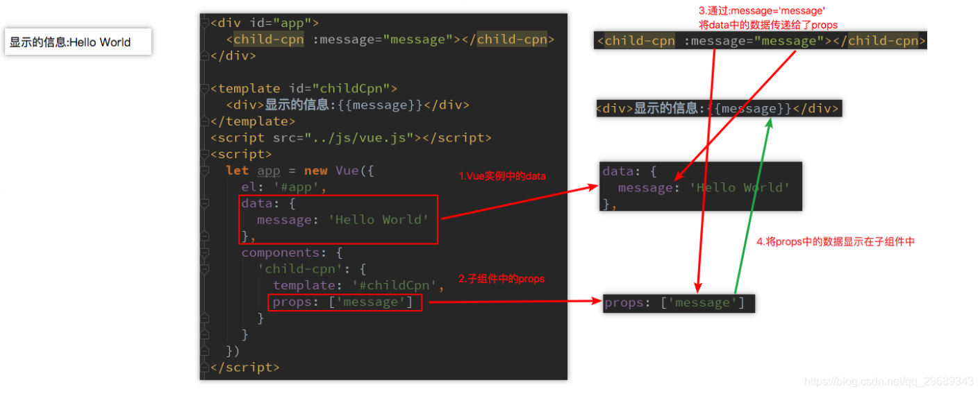 在组件中,使用选项props来声明需要从父级接收到的数据;