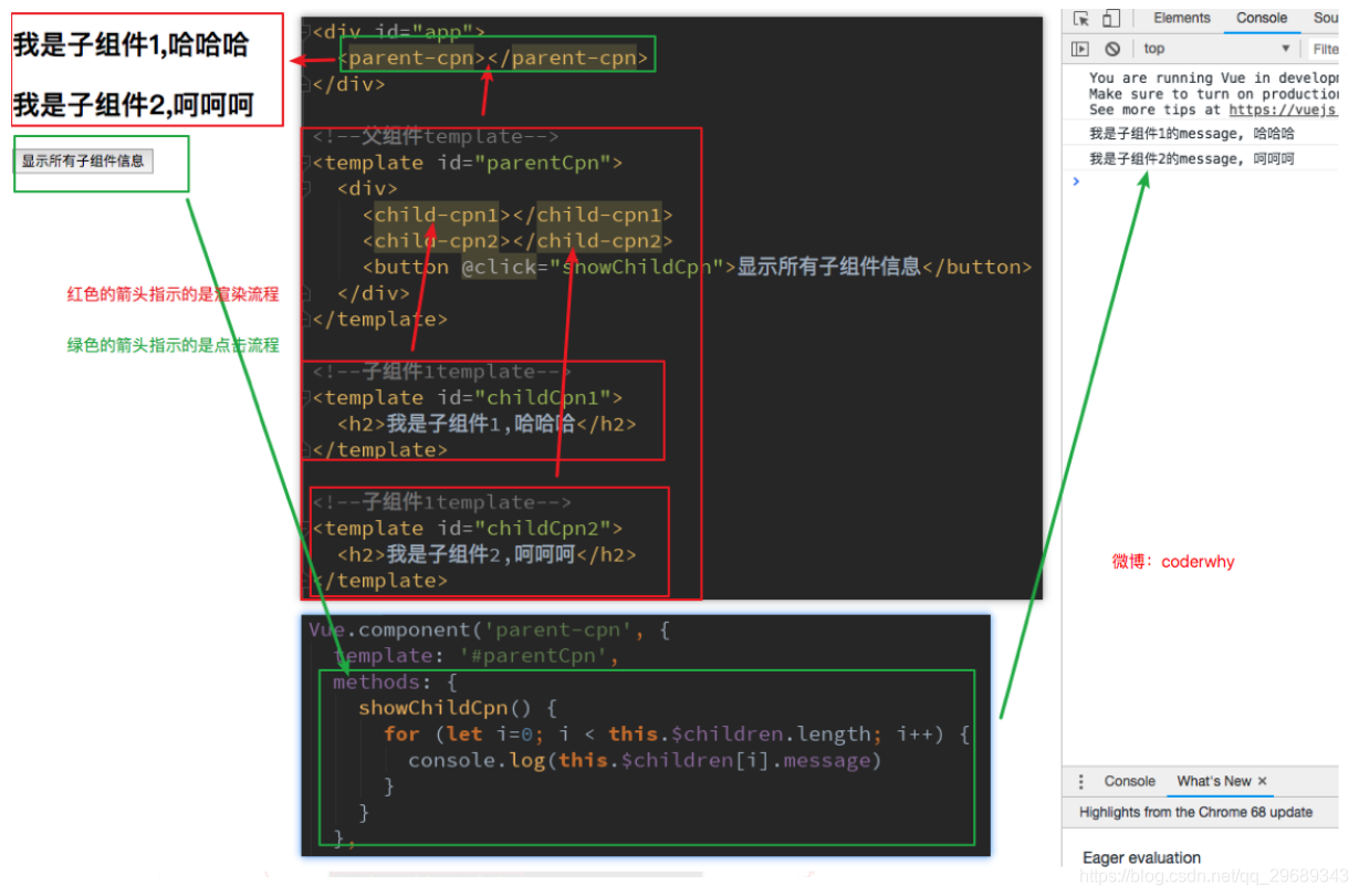 <button @click="showChildCpnMessage">显示所有子组件信息</button>