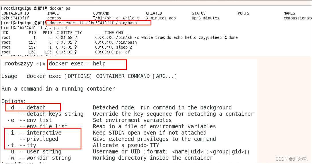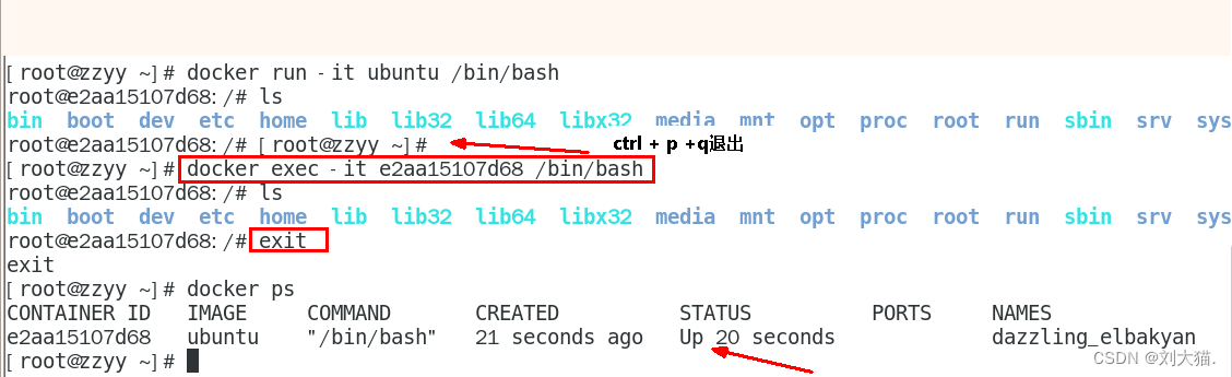 exec 是在容器中打开新的终端,并且可以启动新的进程用exit退出,不会导致容器的停止。