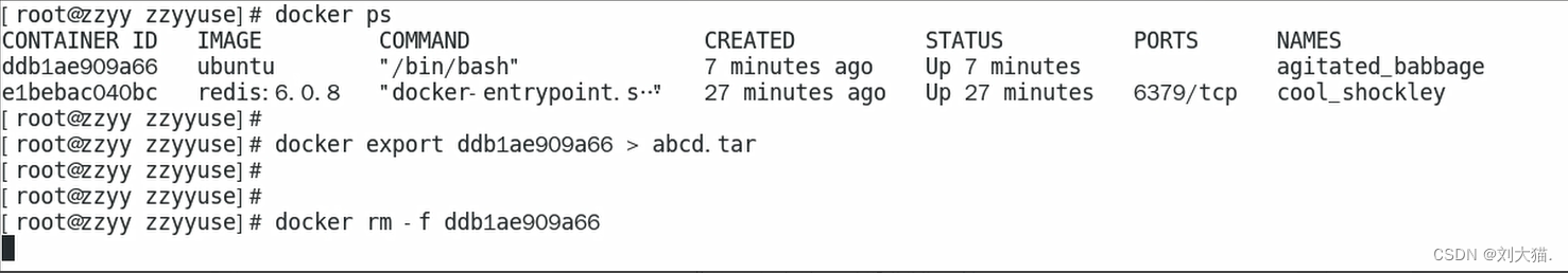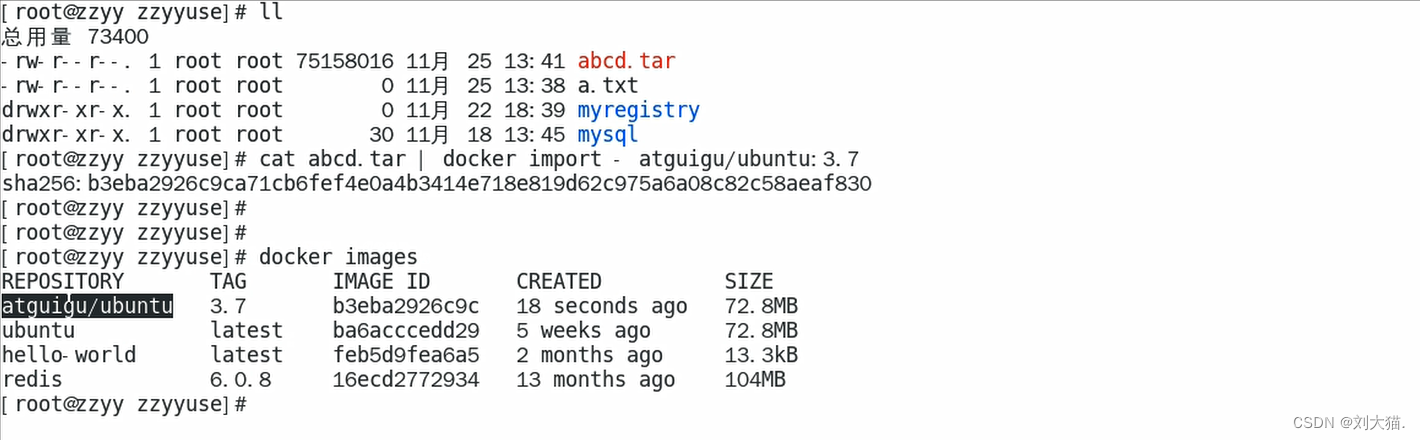案例验证如图:先把ubuntu镜像导出成abcd.jar -> 然后删除镜像 -> 再执行cat导入命令生成新镜像。