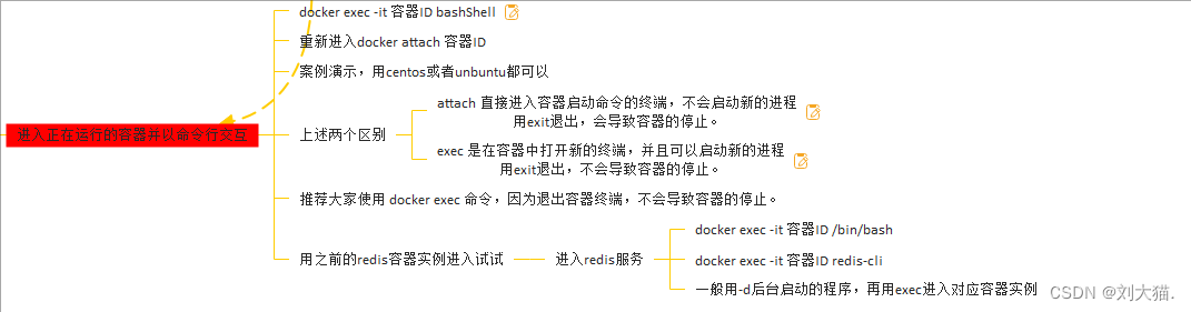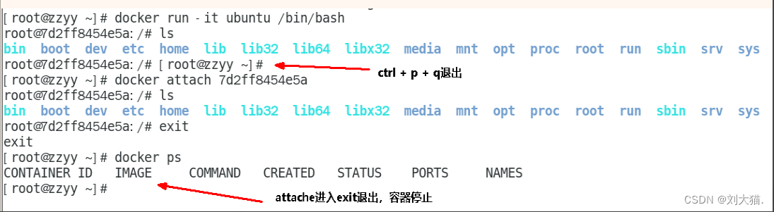 attach 直接进入容器启动命令的终端,不会启动新的进程用exit退出,会导致容器的停止。