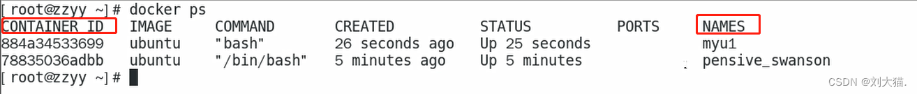 如图1,CONTAINER ID指代容器ID,这里尾号adbb就对应如图2中的容器ID,另外NAME指代容器名字,如果未设置名字,那么系统自动随机分配一个名字,这里的pebsive_swanson就是系统自动随机分配的一个名字。如果如图3中启动服务时设置名字,那么如图1中NAME属性就会显示myu1的名字。