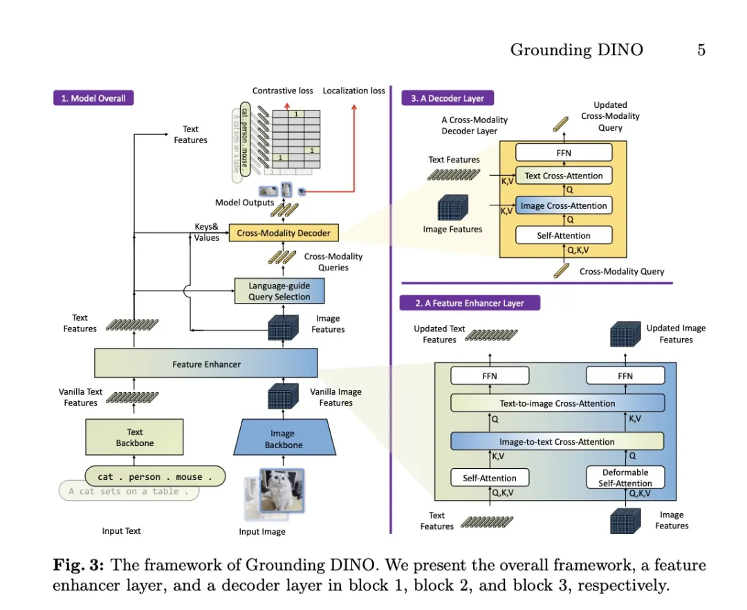 Grounding DINO一种多模态模型的设计,其中包含了三个特征融合阶段:颈部(neck)、查询初始化(query initialization)和头部(head)。这些阶段的目的是增强模型对不同模态(如图像和文本)特征的理解和利用,以提高模型在现有基准测试上的性能。