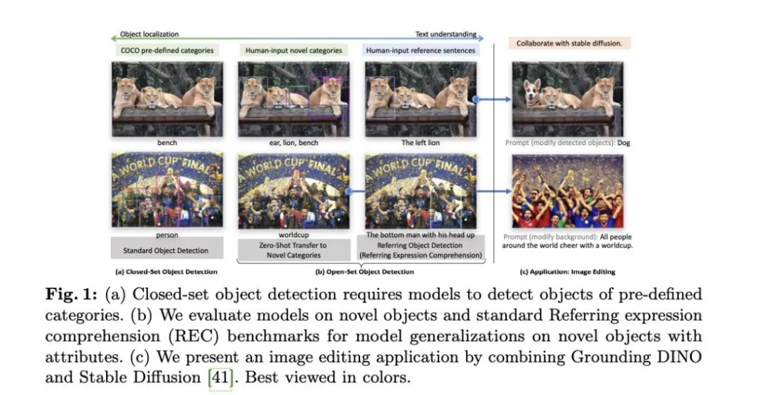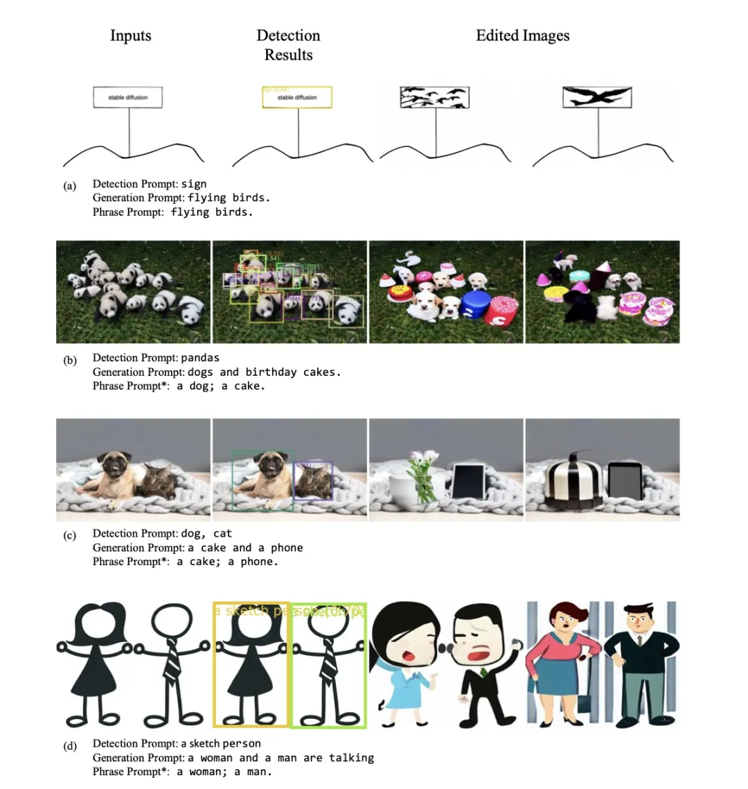 此外,Grounding-DINO还被用于增强细粒度图像编辑能力,通过与GLIGEN结合使用,利用输入短语中的短语提示来生成图像中的特定位置的对象。